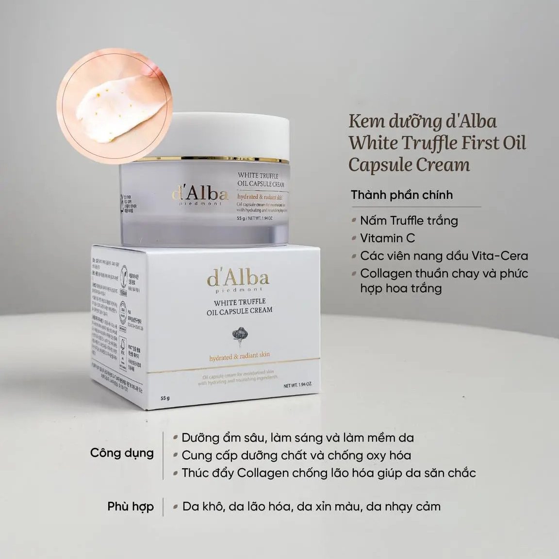 Kem Dưỡng D'Alba White Truffle Vita Toning Capsule Cream giúp làn da trắng hồng – căng mịn – rạng rỡ – đủ ẩm suốt ngày dài, phù hợp cho cả skincare và make up.
