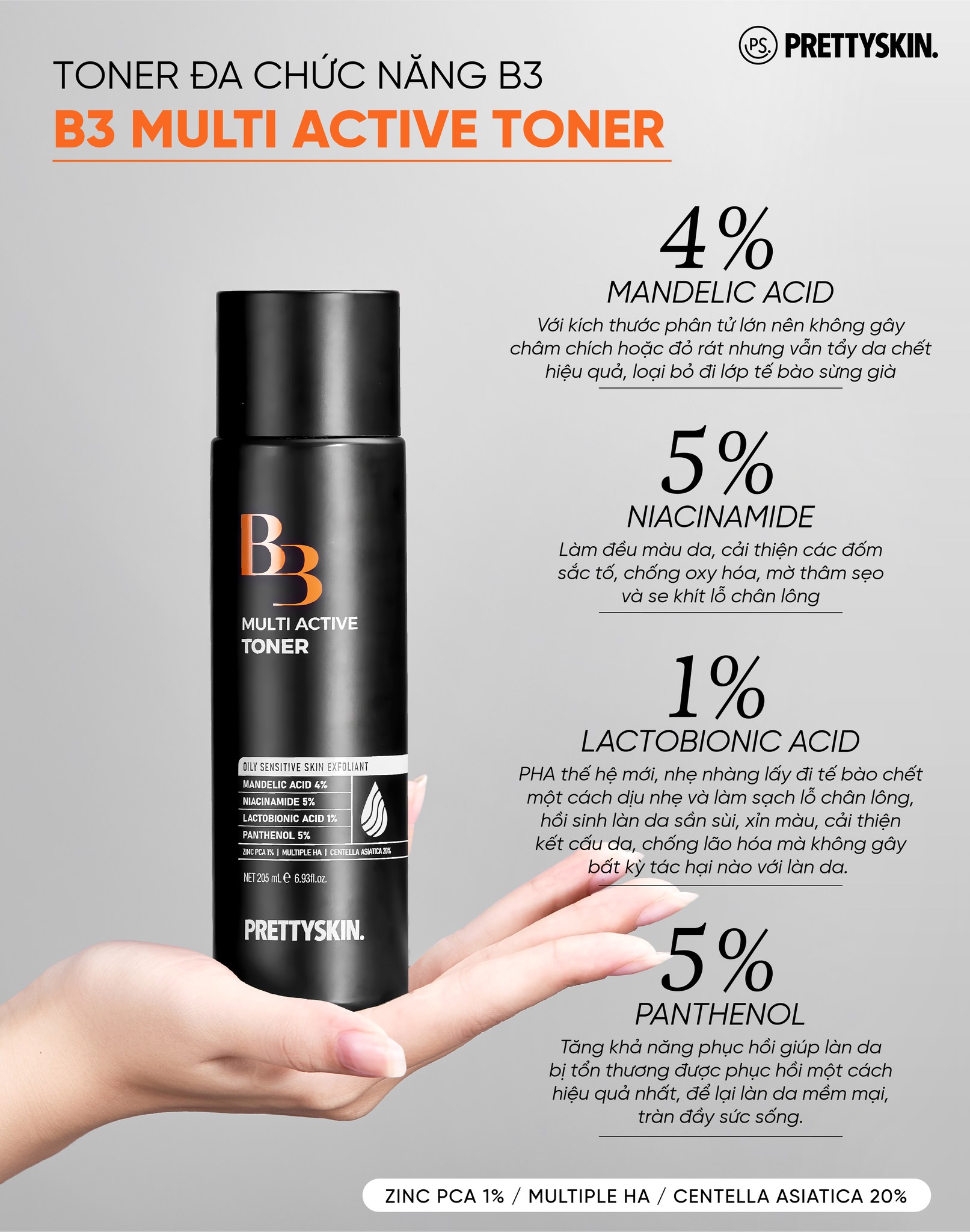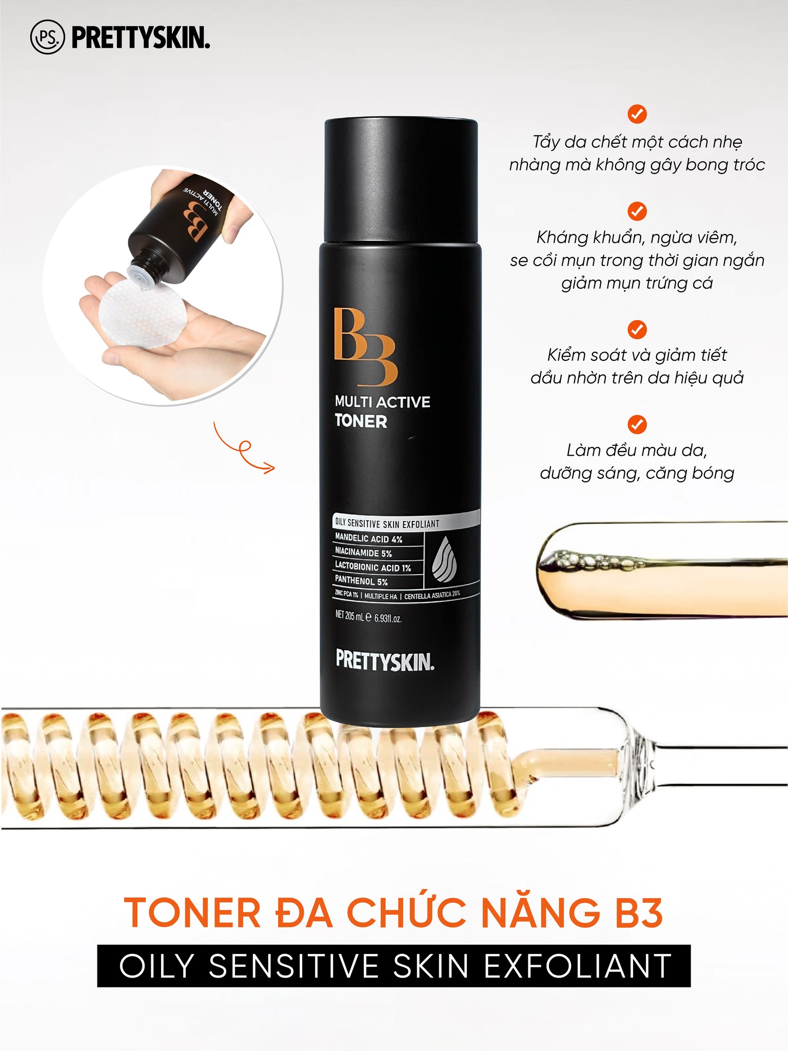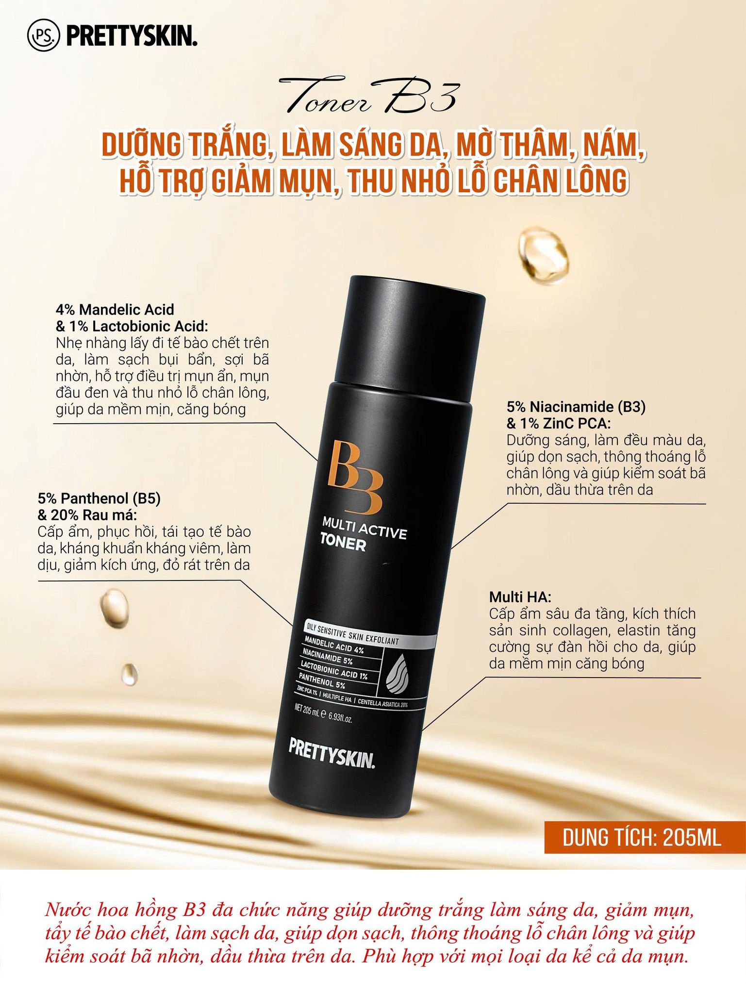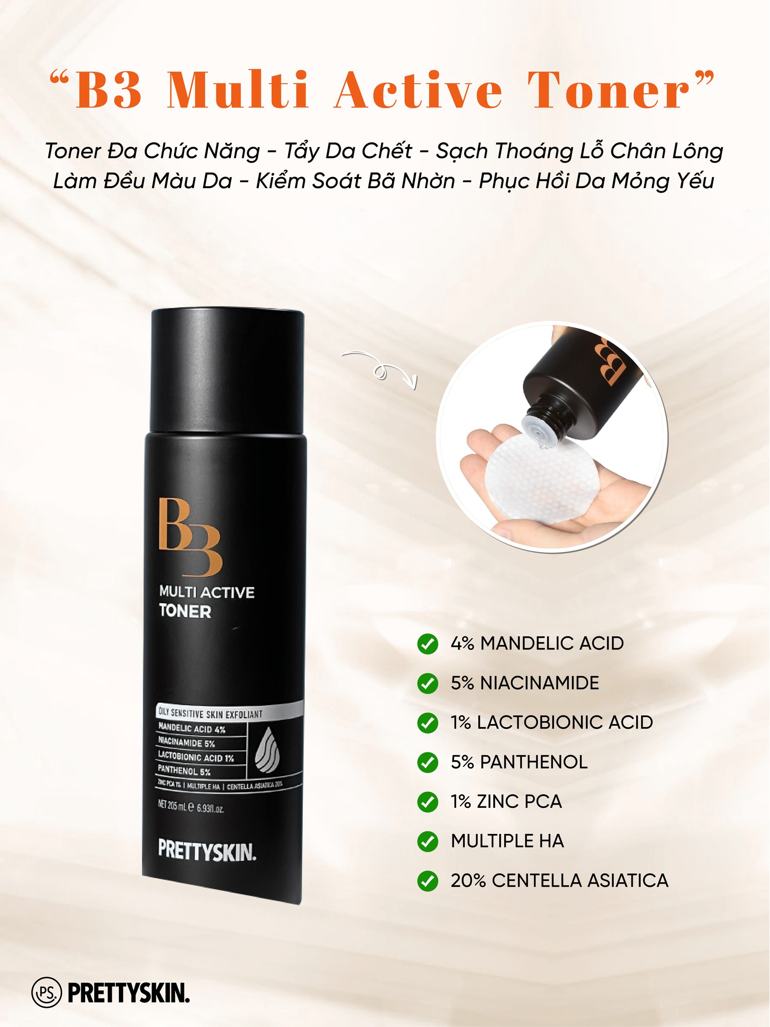 Nước hoa hồng B3 Pretty Skin Multi Active Toner là dòng toner active đa năng đến từ Hàn Quốc, nổi bật với khả năng làm sạch sâu – tẩy tế bào chết nhẹ – dưỡng sáng da – hỗ trợ giảm mụn và thu nhỏ lỗ chân lông. Sản phẩm phù hợp cho nhiều loại da, đặc biệt là da dầu, da mụn và da xỉn màu.