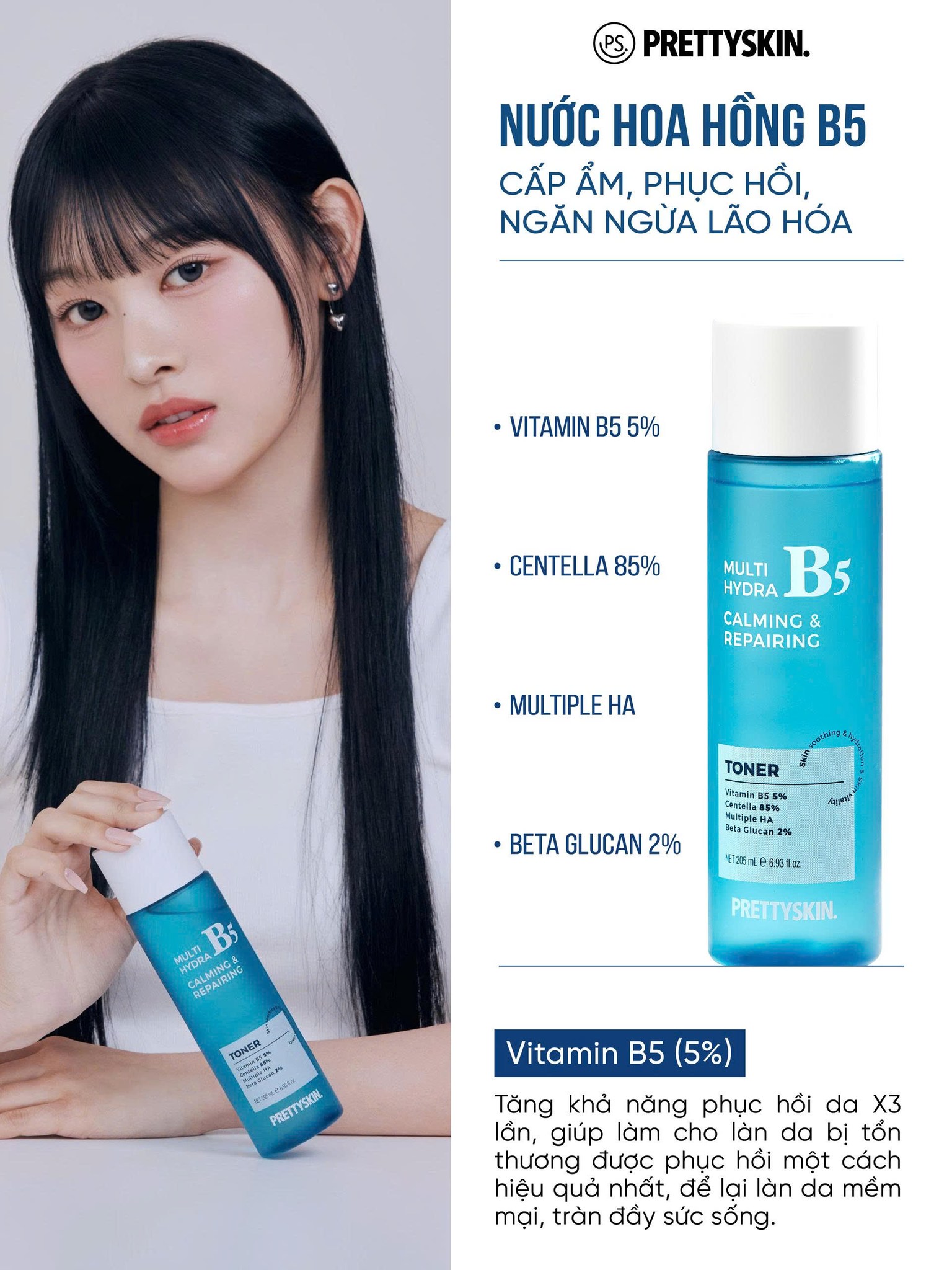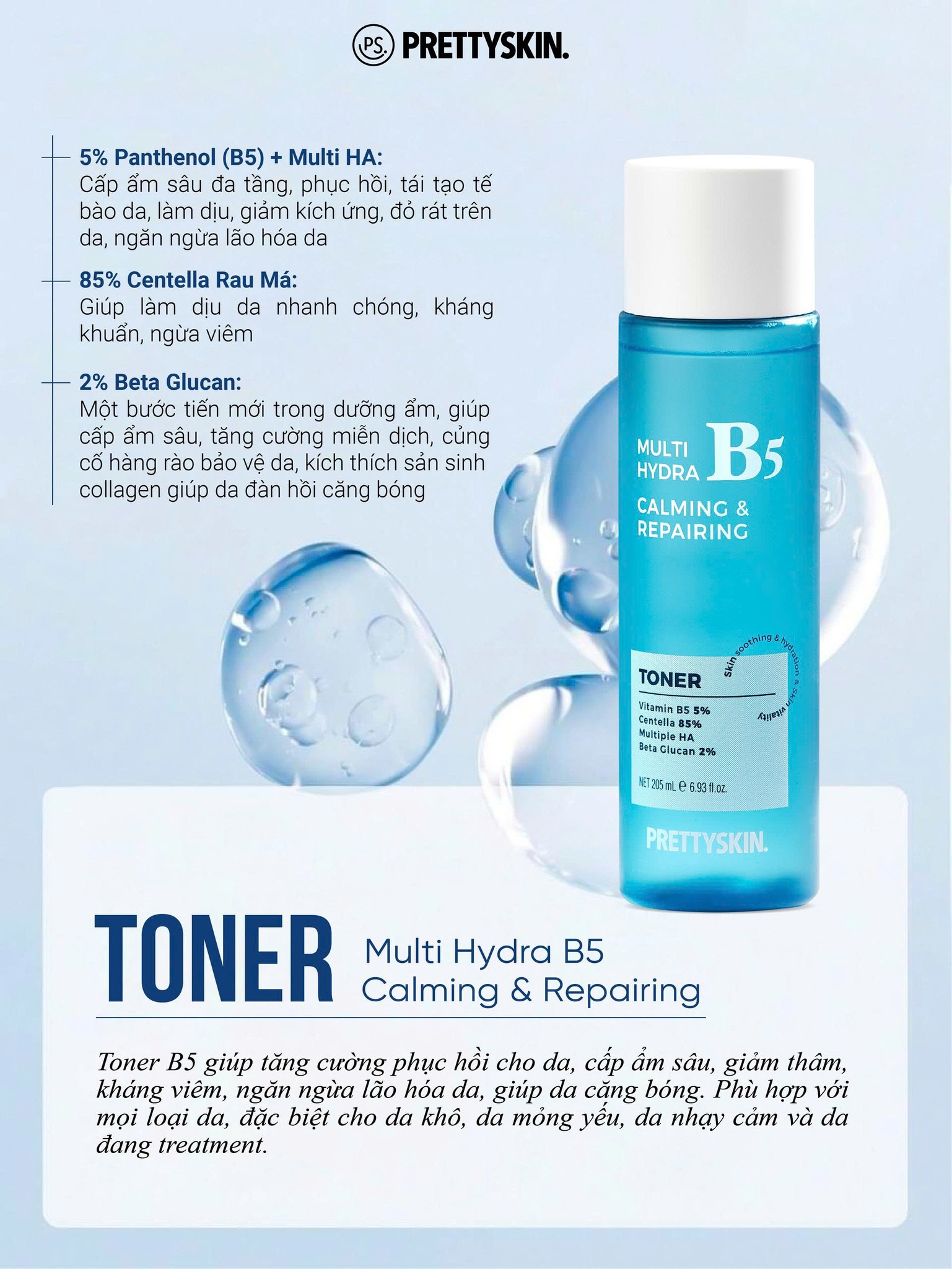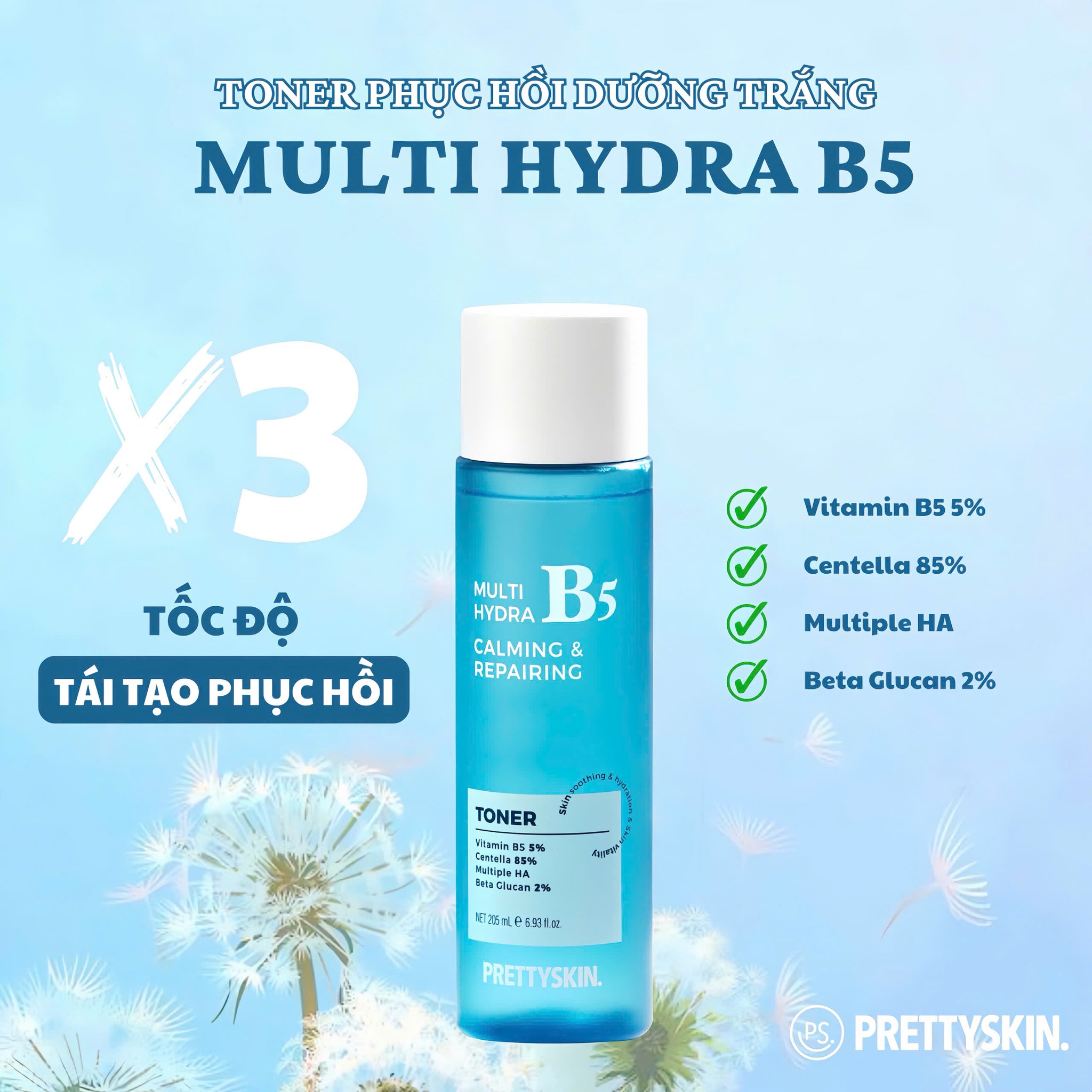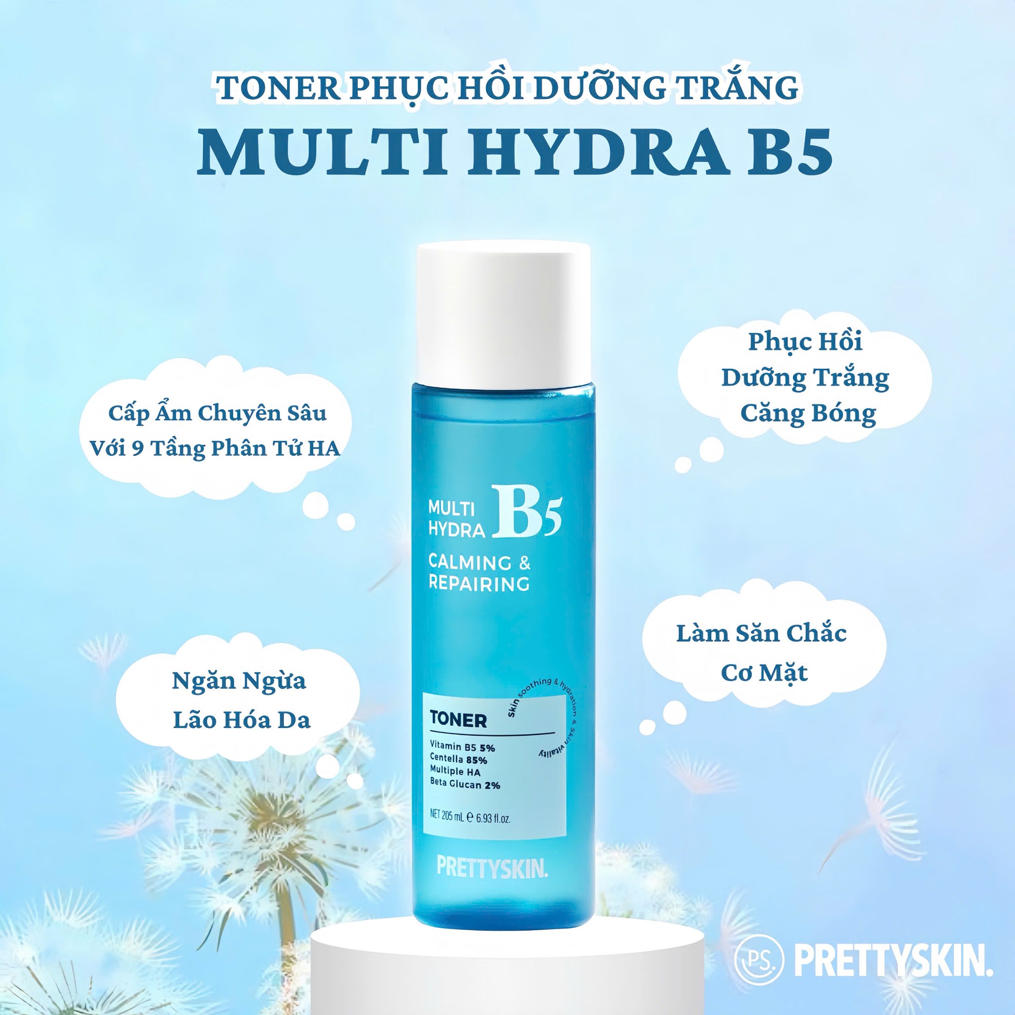 Toner Nước Hoa Hồng Multi Hydra B5 Calming Repairing Prettyskin là dòng nước cân bằng da giúp cấp ẩm sâu – làm dịu – phục hồi hàng rào bảo vệ da sau bước làm sạch. Với thành phần nổi bật Panthenol (Vitamin B5) kết hợp Hyaluronic Acid và chiết xuất rau má, sản phẩm đặc biệt phù hợp cho da khô, da nhạy cảm, da mụn và da đang treatment.